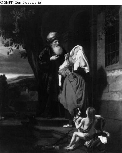 Panel painting: depiction: the casting out of Hagar and Ishmael (Genesis 21:9-21); banish; Hagar; Ishmael