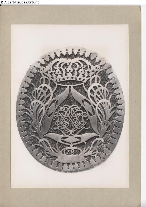 High oval plate with wood (oak) cut-out work: weaver's shuttle set in a triangle within a leaf frame in a palm wreath, inside a baroque mirror monogram, crown at the top, year ‘1786’ below.