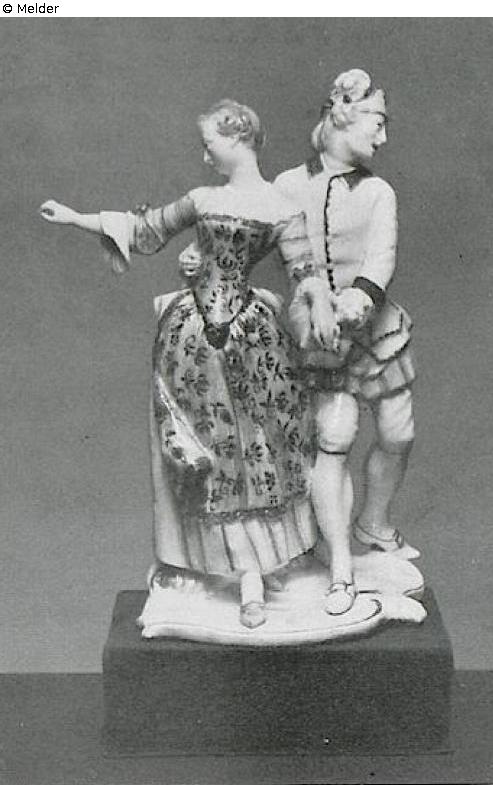 „Läufer mit Konsortin.“ Walking side by side. The runner has put his right arm around the waist of the girl, and with her left hand she holds her left wrist. The girl holds out her right hand. The runner in blue-and-white livery with a feather-fitted runners' hat and a purple-pink hat. On the shield of the hat the sign of Kurbayern. The girl in purple striped, yellow dress with gray, black patterned bib apron. The delicate seed beads of the base are gold-hewn. Head of the runner and left hand of the girl. Pressed-in sign, "unterglasurblaue" hexagram mark and scratched H 1. Model by Franz Anton Bustelli