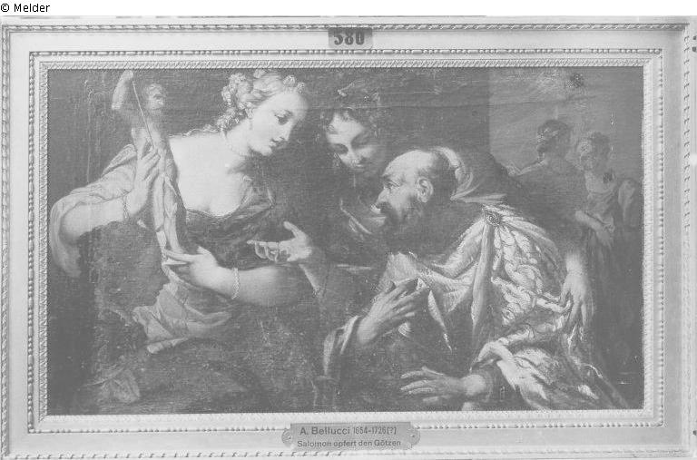 Search Request | Object report Salomon opfert den Götzen Lost Art-ID451277 Previous Next Artist / Creator Bellucci, Antonio Birth 1654 Death 1715 TitleSalomon opfert den GötzenObject typePaintingGroup of reported objectsPaintingMaterial / TechniqueCanvas / painted Height 138.00 cm Width 84.00 cm Inventory number2417 ; 322 (Inv.-Nr. 1905) ; 2888 (Inv.-Nr. 1922) ; München 162 (Inv.-Nr. Ältere Inventare)Description Kat. Galerie Schleißheim 1914, Nr. 3580. Read more Read less Provenance from the Electoral Gallery in Munich; part of the furnishings of the German Embassy in Paris, lost since the end of the war Read more Read less Published since13.02.2012 Contact Staatliche Museumsagentur Bayern Referat für Provenienzforschung Landshuter Allee 8 80637 München Germany E-Mailprovenienz@museumsagentur-bayern.de