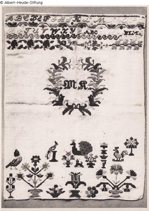 Probably unfinished, rectangular sampler. A laurel wreath with the initials "M. K." in the centre. Two alphabets at the top, various floral and animal motifs in the lower quarter. Sampler (around 1840).