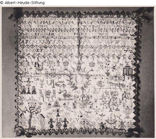 Zigzag bordered square sampler. Five alphabets and number sequences at the top. In the centre a laurel wreath with the crowned initials and date "CSF / SWG / CFS / 1818". In the lower half a colourful mixture of motifs from the Bible, mythology, animals and plants. Sampler 1818
