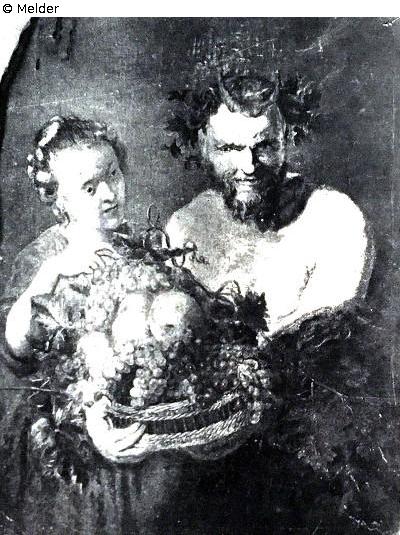 Wood sketch for the painting in the gallery Schönbrunn "Satyr and Girl with Fruit Basket" (Satyr with a Basket of Fruits and a Maiden), formerly in the Schönbrunn Gallery. The wood was originally 33.1, x 24.1 cm tall.