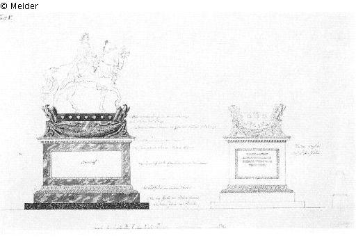Zum Denkmal Friedrichs des Großen und dessen architektonischer Umgebung. [Die figürlichen Details vermutlich von J.G. Schadow, vgl.Kat. 2149. Zum Denkmal Friedrichs des Großen bearbeitete Gentz nacheinander drei Denkmalentwürfe zu den Ausschreibungen von 1791 (1. Entwurf), 1796 (2. Entwurf) und 1805 (3. Entwurf / Verschönerungsplan).]; Blatt 5; Mit handschriftlichen Materialangaben etc. für die einzelnen Teile des Postments (Reiterfigur von Schadow oder nach Entwurf Schadows); Bez.: Blatt V