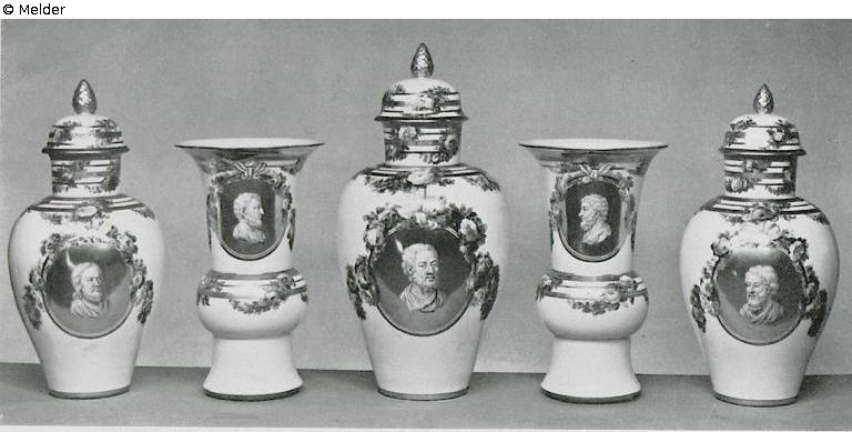 Consists of three slim covered vases and two bellied flutes . At neck, on shoulder and at the cover engraved golden rings interlaced with colourful flowers. At body of the covered vases and at nack of the flutes classical heads on polished golden ground. One cover is luted. Mark of sceptre. Berlin, around 1775. Literature: Auktionskatalog Hans W. Lange, Wertvolles Kunstgewerbe, Berlin, 19.-21. Mai 1941, S. 163. Nr. 795, Taf. 82 (DOI: external link)