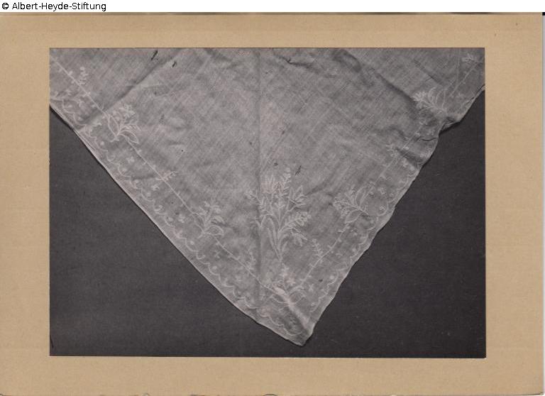 Triangular cloth in white with floral motifs in so-called „Kurbelstickerei“.