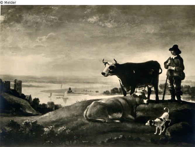 unclearly signed at lower right: A. Cuyp; identical with "Weite Landschaft mit Flusslauf"; in front shepherd with two cows and dog;