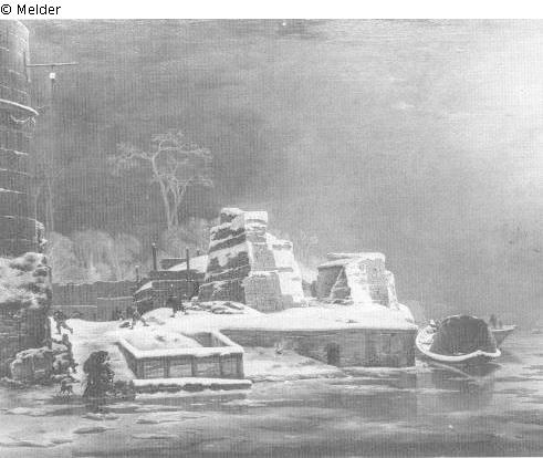 Im Vordergrund eisbedeckte Wasserfläche, dahinter ein befestigtes Ufer mit schneebedeckten Mauerresten, links ein angeschnittener Turm, rechts ein eingefrorener Kahn, Figurenstaffage: Schneeballschlacht mehrerer Kinder und anderes; Signatur: JA (ligiert); Maße: 66,8 x 81,5 cm