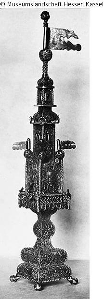 Gilded flag on top and 4 small corner flags, 3-storey square tower, basement with spice box and door, lock and key on one side, the other three sides with gilded medallions. Flemish church tower charakter. Claw ball feet, stem also filigree in baroque shape. Number in the spice box.