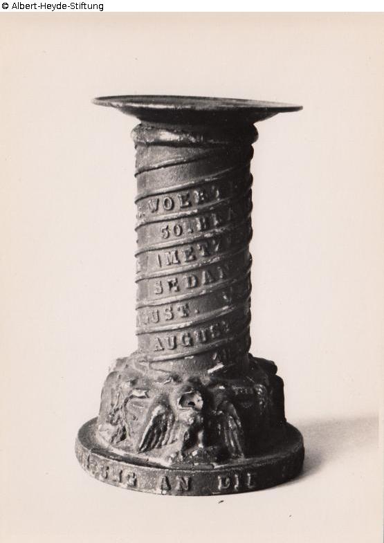 Compact, column-shaped, green-lacquered candlestick with a plate-shaped nozzle. On the base plate: “ZUR ERINNERUNG AN DIE SIEGE 1870” Above it, a pedestal with three eagles and laurel vines. A ribbon spiral wrapped around the shaft with a calendar of significant battles from the war of 1870: „4. August Weissenburg b. Wörth – 16. August Gravelotte – 30. August Beaumond (Metz) – 1. September Sedan …“. Underneath the base is the manufacturer's mark: “Schaefer & Hauschner, Berlin Friedrichstr. 22.”