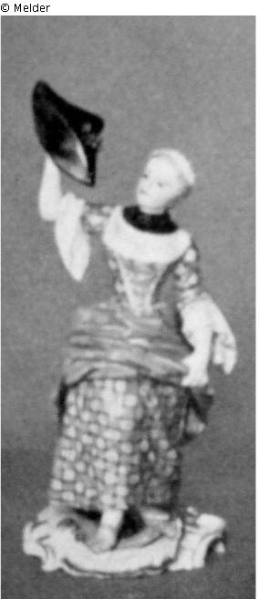 mit Weintrauben in einem Dreispitz, den sie in der erhobenen Linken hält. Bunte Bemalung. Violett staffierter Rokokosockel. Marke: Steigender Löwe und PH.