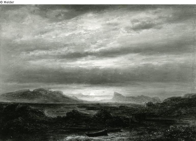 In front the rocky shore with many bays near Arisaig. In the middle two fishermen at their boat pulled to the beach. In the background the rocky island Eigg. In the middle the sinking sun in grey clouds above the horizon.