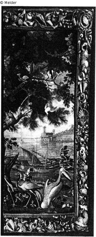 Blick auf See mit Turmgebäude am Ufer. Links Baumkrone mit bunten Vögeln. Segelboot vor Anker, vorn am Ufer Pelikan und Reiher. Muschelborte. (Linke Borte fehlt, rechte angenäht.) Gehört zum vorhergehenden.
