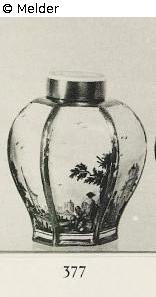Six-sided, bulged. Ribs gilded. Cundial river landscape with tower architecture, figures and ships. Sword mark indistinct. In Gold: D.
