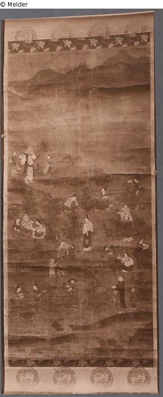 Rising terrain lost in the mist. The peaks and ridges of high mountain ranges rise out of the mist. On the lower slopes, girls are busy harvesting tea, individually and in groups. An old man leans on his stick and watches them work. From above, a distinguished gentleman comes down the hill with his armed companions. The painting on brownish silk is colourful. The robes of the figures are decorated with gold. Framed