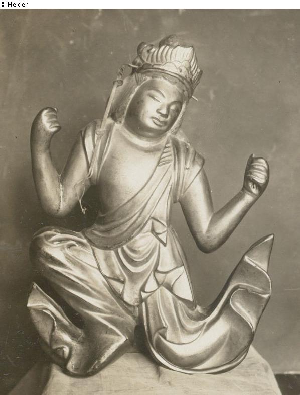 The tennin sits quietly on the floor. In both raised hands he holds the mouth organ. On his head sits a richly decorated diadem with pendants. The flattened back shows that the figure was attached to a shrine or a giant gloriole.