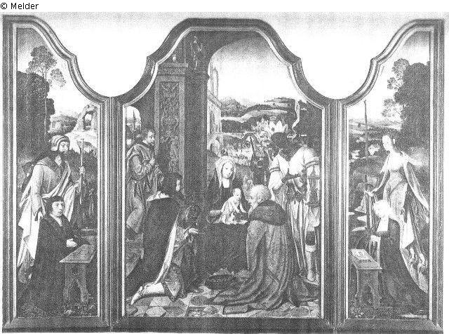 Centrepiece: The Adoration of the Magi under an architectural arch with rich ornamentation. Saint Mary in green robe with the child to whom the Magi are offering gifts. On the left Saint Joseph. Middle ground: Palace architecture and rich figurative staffage. Hilly landscape in the background. Left wing: In the foreground a holy pilgrim with a pilgrim's hat, in his left hand a staff and a bag, his right hand resting on the shoulder of the founder kneeling in front of him. Tree-rich landscape with rock gate and castle in the background. Right wing: Saint Catherine with sword in her right hand with crown and rich brocade robe, her left hand turned protectively towards the founder kneeling in front of her, behind whom the two little daughters are kneeling. River landscape with a dense group of trees, black frame, M.J. Friedlaender writes. A work by the Master of St. Sang, who was active in Bruges around 1510. The head of the donor seems to be painted by another hand - apparently by Adriaen Isenbrant.