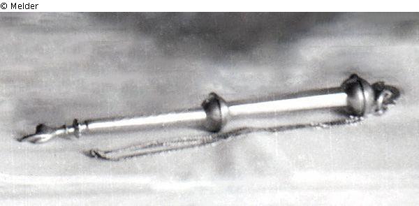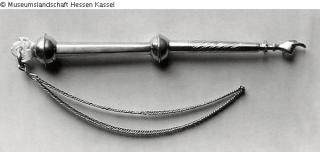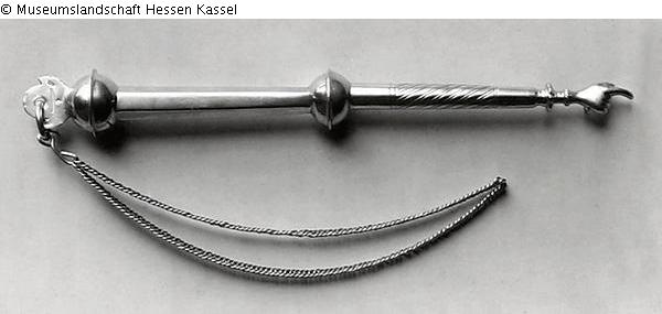 With chain, upper part hexagonal, ball knob on top and in the middle, lower part round with diagonal lines and hand with cuff. Silver mark.
