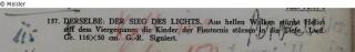 at the latest since 1921 Eduard Fuchs Collection until 1933; 25.10.1933 confiscation by the Gestapo; auction house Rudolph Lepke, Berlin, catalogue 2114, p. 16. On 16 and 17.06.1937 the painting is published as No. 137: "Max Slevogt: Der Sieg des Lichts. Aus hellen Wolken stürmt Helios mit dem Viergespann.: Die Kinder der Finsternis stürzen in die Tiefe. Lwd. Gr. 116 x 50 cm. G.- R. Signiert" auctioned off; awarded RM 115,- to an as yet unidentified art dealer or collector; 23.04.2001 Sotheby's (Amsterdam), lot 98; whereabouts unknown