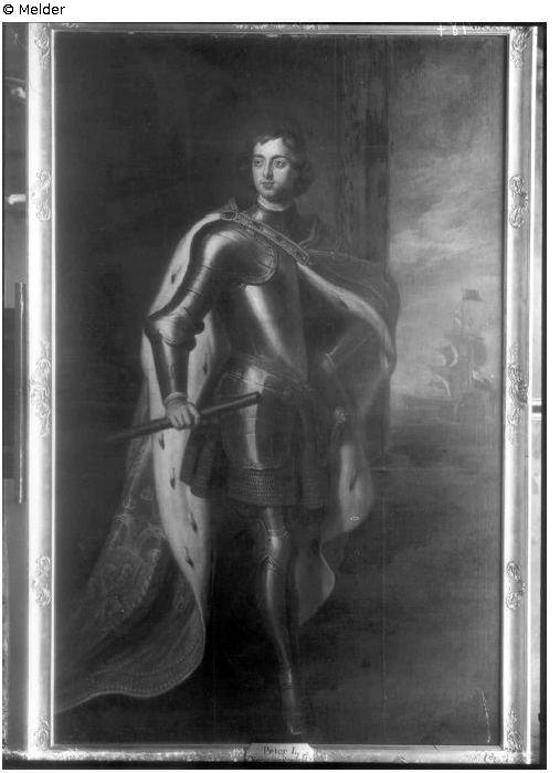 Painting with gilded frame. The sitter in armor with ermine coat with pearl trim and with the Russian eagle; in his right hand a baton, on the left on a table the crown; in the background a harbor bustling with sailing ships.