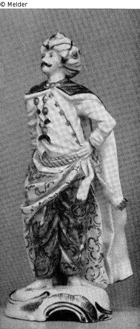The Turk stands in a straight posture, his left hand resting on his hip, his backward stretched hand on his cloak. He wears a blue-laced turban set with precious stones, long white robe gathered at the sides with yellow lining and rocaille pattern, light purple breeches with purple rocaille pattern, iron-red, white-lined cloak with black hem, yellow shoes, breast pendant of coloured stones with crescent moon, blue-striped sash with dagger. Brand: blue cross; white, round-arched base with purple heightened rocailles