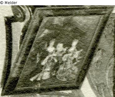 Two ladies sitting, child in the middle, presumably in the wooden frame with chinoisem lacquer decor; Belonging to a series of costumes in the mirror cabinet by Schloss Favorite; See also the comparison ills.: external link