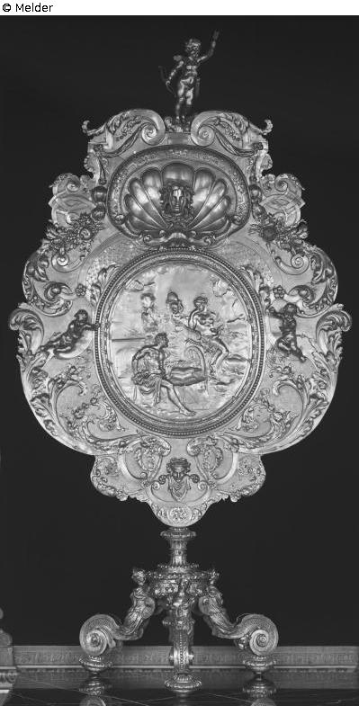Presumably purchased in 1719 for wedding celebrations. It was kept in the audience chamber of the royal palace; As part of the 1924 settlement agreement between the Free State of Saxony and the former royal house, the fireplace screen with the figure on top fell to the Free State of Saxony as room inventory; Presumably in August 1943, the fireplace screen was removed to Rammenau Palace due to the war; The further whereabouts of the figure on top are not known; A loss in connection with the events of the Second World War is suspected.