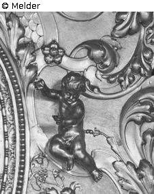 Two putti figures to the left and right of the main motif of a fireplace screen. The figure on the right is looking downwards and holding a flower upwards with his right arm. The figure on the left is depicted half reclining and looking down to the left.