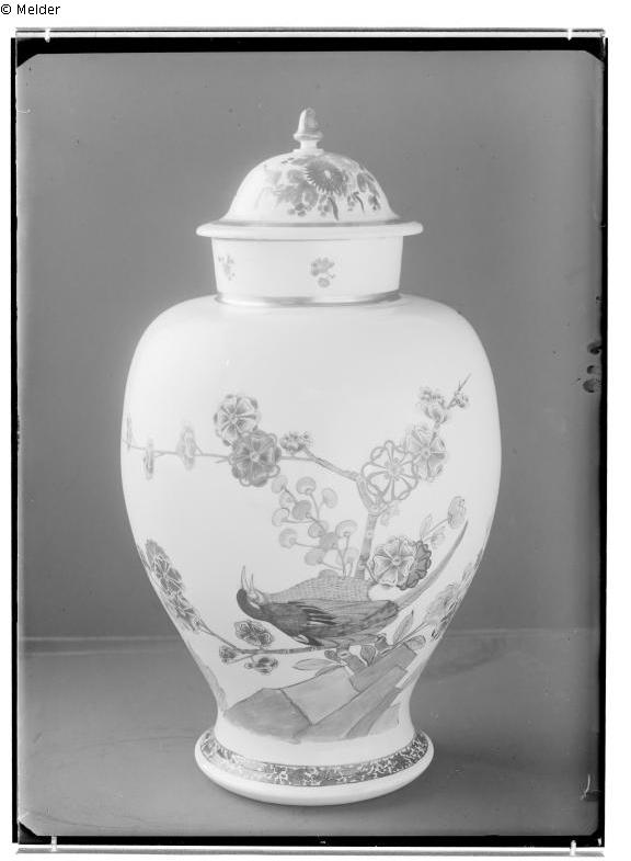 "66. Deckelvase, Blütenstrauch auf plattigem Grund, großer, hängender Vogel, Schmelzfarbenmalerei in Rot, Blau, Gelb, Grün, Schwarz, Gold, Meißner Porzellan, AR III 68+, (fraglich, ob der Deckel echt ist),