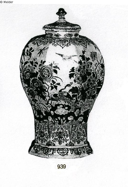 Blaumalerei, Beschreibung Lepke: "Große achtkantige Deckelvase; Birnform mit gewölbtem Stand, kräftig eingezogener Ablauf, niedriger Halsring mit verhältnismäßig kleinem Deckel mit Eichelknauf. Blauweiß mit großen Päonien- und Chrysanthemumstauden; am Fuß, Ablauf, Schulter und Deckel dünnlinige Spiral- und Blütenranken-Ornamente."; Inventarverzeichnis Sammlung Rosenbacher [dort Zuschreibung Frankfurt]; Katalog Lepke, Die Sammlungen des verstorbenen Freiherren von Minnigerode-Allerburg, 1.Teil, 9.-13.10.1917, Katalognummer 939; Schätzwert 700,- M +13%