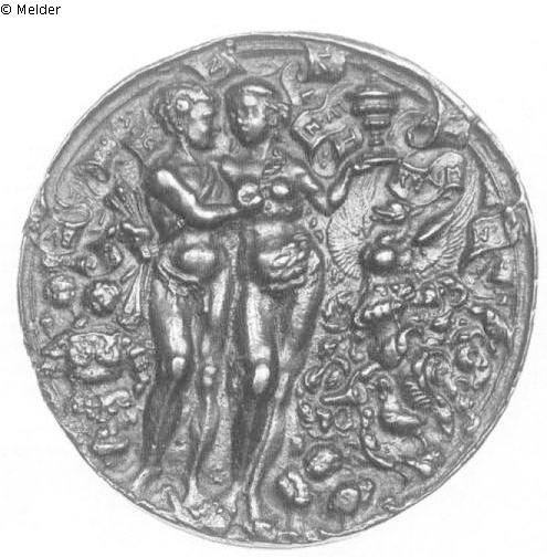 Runde Plakette. Mars und Venus stehen nackt nebeneinander und umarmen sich, Venus hält einen Pokal in der erhobenen linken Hand. Links halten zwei Putten den Panzer des Mars, ein weiterer liegt der Venus zu Füßen. Rechts sieht man ein behelmtes Familienwappen mit einem schreitenden Hahn und oben ein verschlungenes Band mit der Inschrift VERBVM DOMINI MANET IN ATTERNVM. Die Plakette stammt von einem Siegelstecher, der nach Habich mit Heinrich Aldegrever identisch ist, von dessen Stich von 1528 (Bartsch 226) die Venus übernommen wurde. Zwei weitere Arbeiten, das Friewirthersche Siegel mit einer geflügelten Judith von 1532 (Bange 1923, Nr. 7940) und ein Stempel des Herzogs Franz von Braunschweig-Gifhorn im Berliner Münzkabinett von 1549, wurden ihm von Volbach zugeschrieben (W. F. Volbach, Amtliche Berichte aus den Preussischen Kunstsammlungen XLII, 1920/21, S. 66ff.). Das Wappen ist wahrscheinlich das der mecklenburgischen Adelsfamilie Hahn.