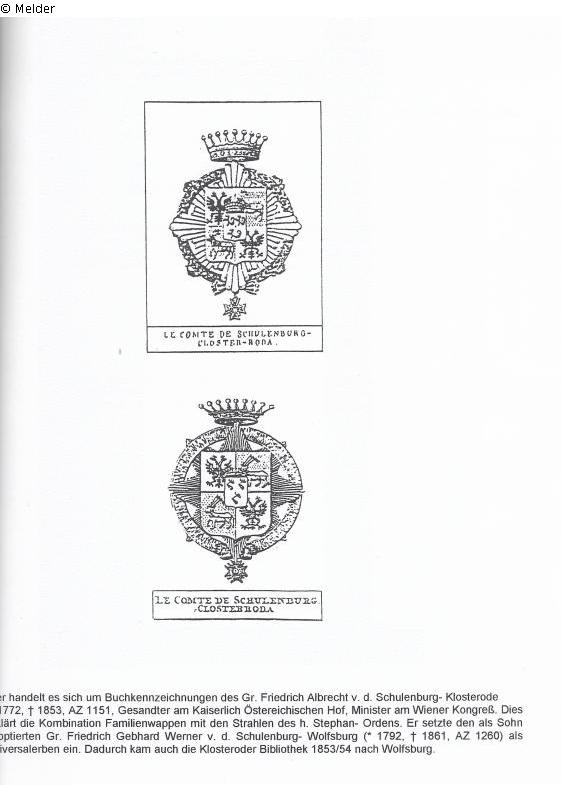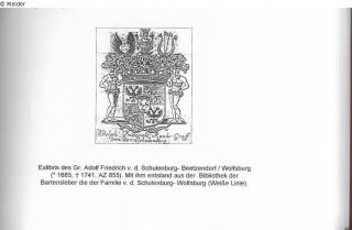 According to Ursula Gräfin von der Schulenburg-Wolfsburg, née Freiin von Dincklage (* 1905, † 1951), the grandmother of Günther Graf von der Schulenburg, the legal successor to the then owner of Neumühle Castle and its inventory, a selection had to be made as to which items could be taken with them and which had to be left behind due to the lack of transport capacity when leaving Neumühle Castle in flight before it was taken over by the Red Army. Among the cultural goods left behind were the volumes from the castle's own historic library.