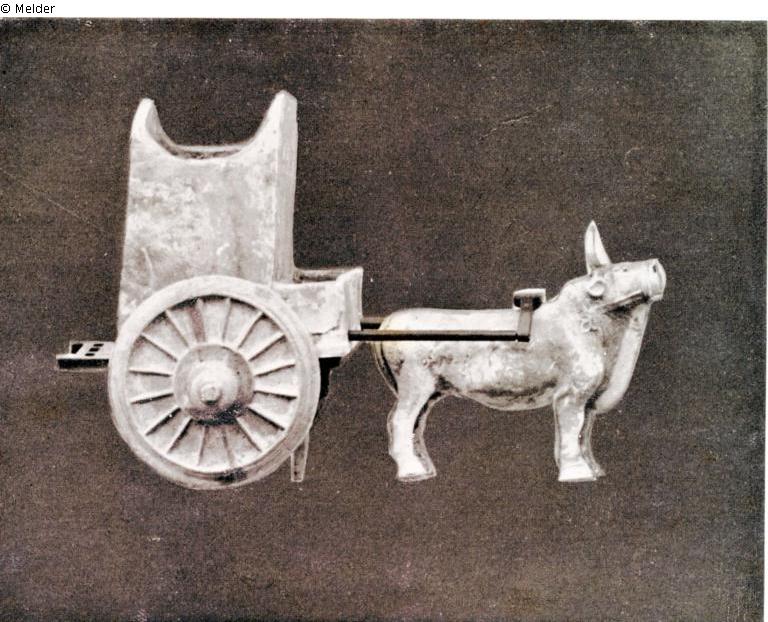 Fuchs text for plate 59: „Zugstier mit zweiräderigem Wagen. Weißlichgelber Tonscherben. Cremefarben glasiert. Höhe 28 cm.“