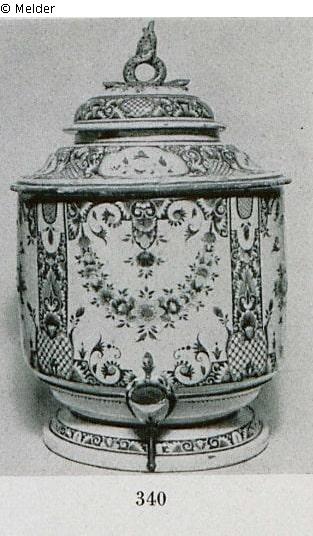 barrel-shaped with snake-crowned lid and mask at the spout. Colourful decoration: flowers and ornaments.
