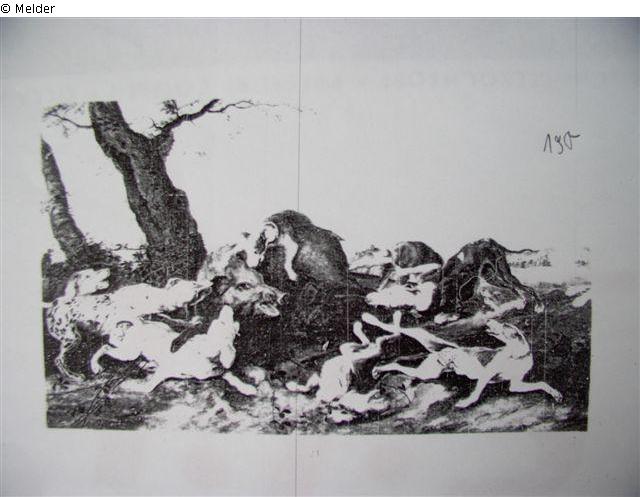 Der braune Eber ist umringt von den angreifenden hellbraunen, grauen und gefleckten Hunden. Weite Ebene in grünlicher Färbung unter leicht bewölktem Himmel; Abb.: Répertoire des biens Spoliés en France, Nr. 454