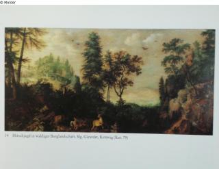 im Vordergrund über Felsen fliehende Hirsche, deren einer von jagenden Hunden angegriffen wird, rechts auf steiler Felswand Gemsen, zarte Nadel- und Laubbäume ragen in den bewölkten Himmel, der von vielen Vögeln belebt ist, links im Hintergrund eine waldige Bergkuppe in zartem Grün, rechts Blick in bewaldetes Tal; weitere Titelbezeichnung: Hirschjagd in waldiger Berglandschaft