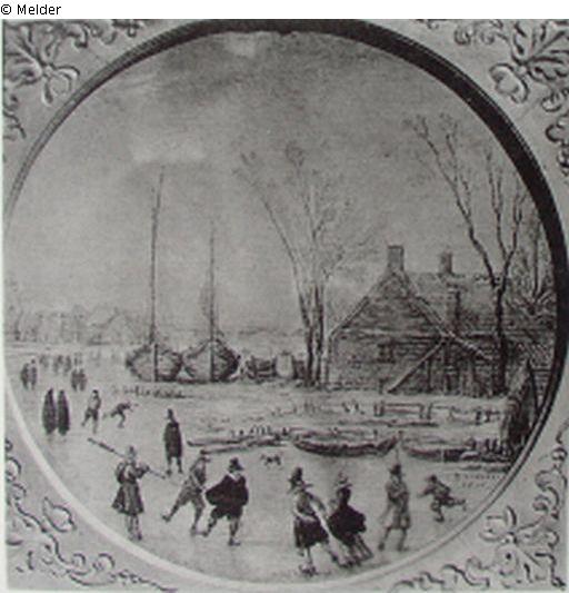 Winter, Zugefrorener Fluss auf dem sich zahlreiche Schlittschuhläufer bewegen, mit zwei auf Strand gesetzten Fischkuttern. Seitlliche re. Ein Bauernhaus. Im Hintergrund links ein Dorf. Sign. E.v.Velde 1609