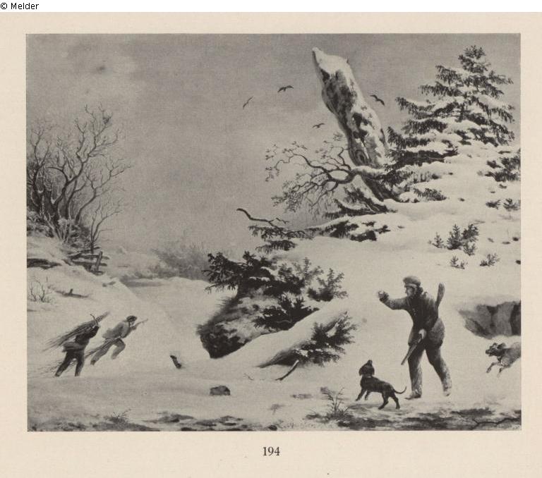 Winter landscape with hunter and dog as well as wood gatherers.