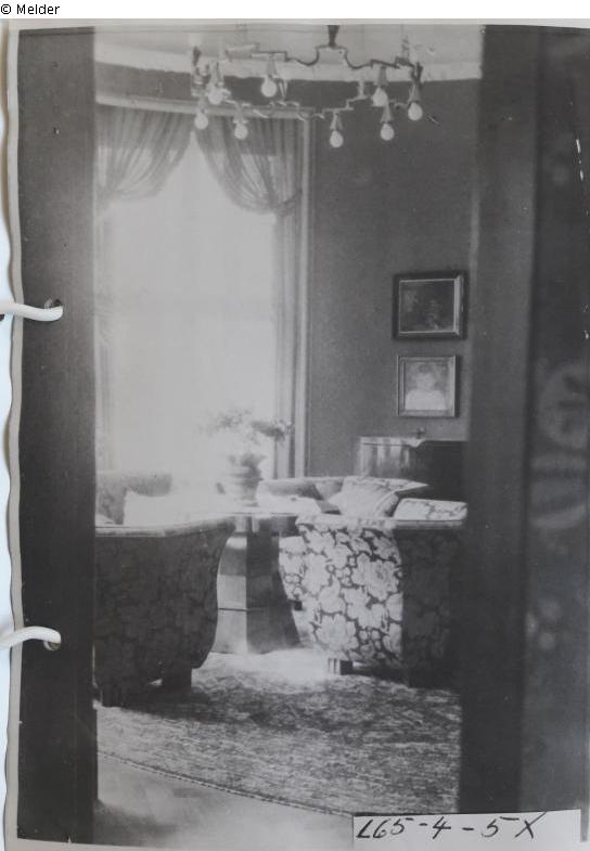 a woman hands a drink to an old man with a white beard - this description might be disleading: it may either indicate a painting showing a man and a woman in a ladies' salon, or it may indicate that a painting of a man and a woman once were exhibited in the ladies' salon of the villa in Breslau]