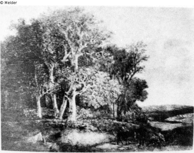 Am Rande eines alten Hochwaldes führt ein Hohlweg vorbei, auf diesem ein Maultiertreiber und ein Fußgänger. Rechts Ausblick auf eine bewaldete Hügellandschaft.