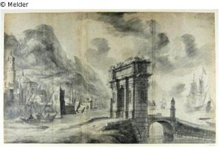 Found-Object Report Fantastic port city at mountains, at the foreground a arch with bridge Artist / Creator Beerstraten, Jan Abrahamsz (1622 - der Ältere) (?) Artist / Creator Beerstraten, Jan Abrahamsz. (der Jüngere) (?) Object type Drawing Material / TechniqueChalk ; Paper / drawn ; drawn (brush)Lost Art-ID457600