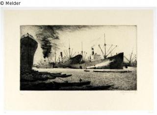 Found-Object Report Ocean liner in the port Artist / Creator Goldschmitt, Bruno Object type Print Material / TechniquePaper / printed (etching)Lost Art-ID429454
