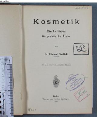 Found-Object Report Kosmetik: ein Leitfaden für praktische Ärzte Author Edmund Saalfeld Publisher Julius Springer Object type Library objects Lost Art-ID622803