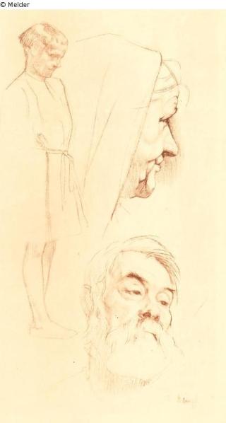Search Request Standing boy in the apron skirt, head of a woman in the profile and head of a man from the front Artist / Creator Kampf, Arthur Object type Drawing Material / TechniqueRed chalk ; Paper grey-green / drawnLost Art-ID143731