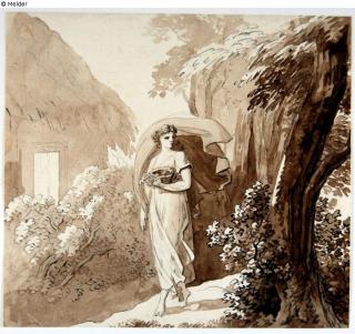 Found-Object Report Woman with vessel next to a straw hut left Artist / Creator Kobell, Franz Innocenz Josef Object type Drawing Material / TechniqueGraphite / drawn (pen-and-ink drawing) ; drawn (brush)...Lost Art-ID579262