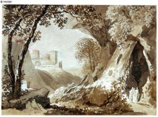 Found-Object Report Landscape with castle, on the right two figures in front of rocks Artist / Creator Kobell, Franz Innocenz Josef Object type Graphic Material / TechniqueGraphite ; Colour sepia / drawn (brush) ; washedLost Art-ID579267