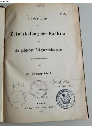 Found-Object Report Geschichte der Entwicklung der Kabbala und der jüdischen Religionsphilosophie Author Bloch, Philipp Publisher Mayer Object type Book Lost Art-ID632654