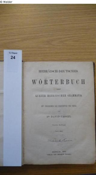 Found-Object Report Hebräisch-deutsches Wörterbuch nebst kurzer hebräischer Grammatik Author Cassel, David Publisher Heinrich Handel Object type Book Material / TechniqueboundLost Art-ID452537