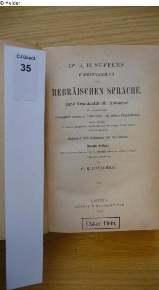 Found-Object Report Dr. G. H. Seffers Elementarbuch der hebräischen Sprache. Eine Grammatik für Anfänger Author Seffer, G. H. Publisher Friedrich Brandstetter Object type Book Material / TechniqueboundLost Art-ID452539