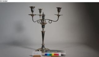 Found-Object Report Three-armed silver candlestick Artist / Creator Hues, Johann Object type Light / lamp Material / TechniqueMetal (Silver) / cast ; mounted ; repoussé ; soldered...Lost Art-ID626414